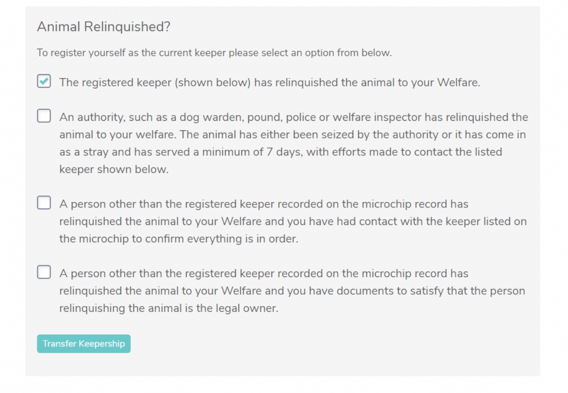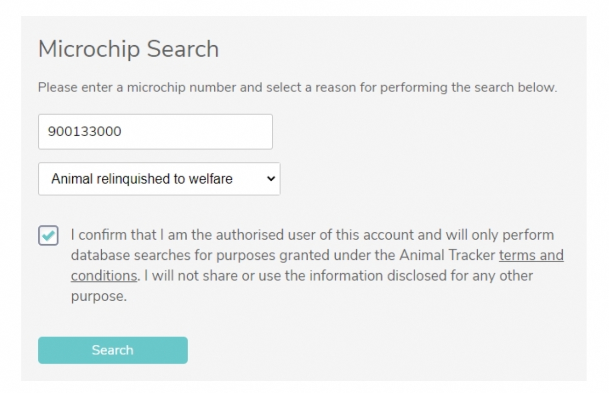 If you are a Welfare organisation with a charity number then, once authorised, you will be granted full look up rights. (If you do not have a charity number then you will need to email welfaresupport@animaltracker.co.uk with the microchip details and the relinquishment paperwork / or details of how the animal came into you and then Animal Tracker will manually process the update).